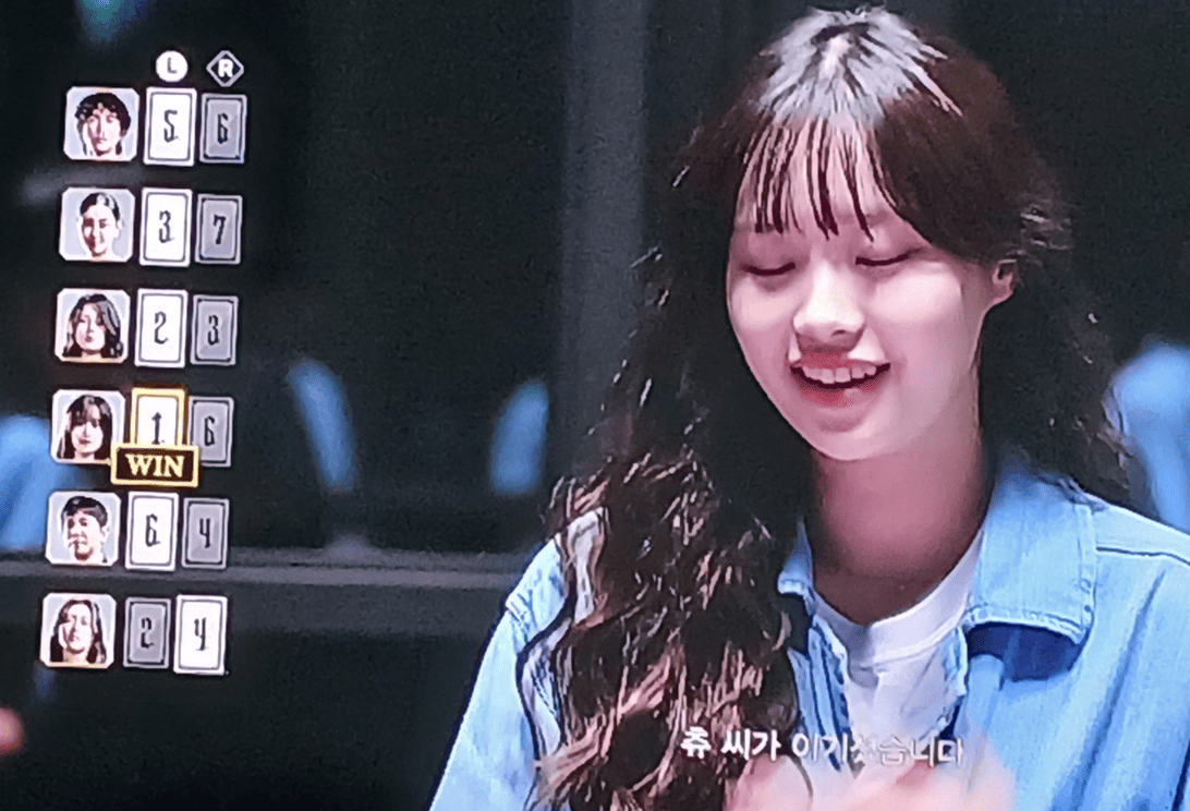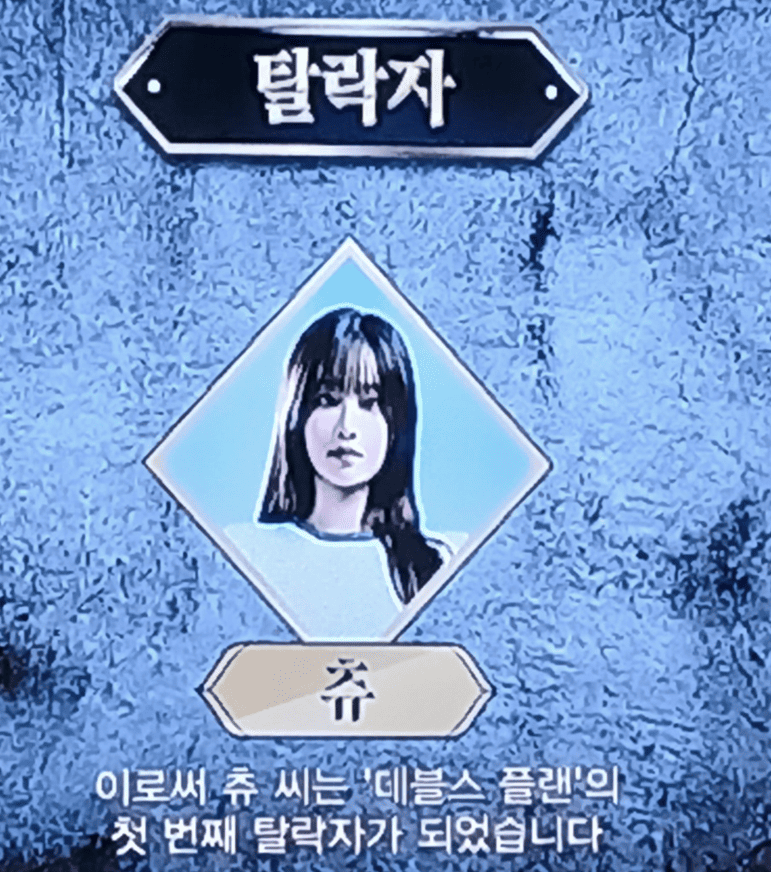 - 마지막까지 생존 확정되지 못한 1명은 탈락 + 피스 전부 몰수 (아래의 이미지에서도 알수 있지만 첫번째 탈락자는 '츄'입니다.)