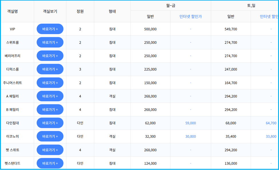 - 이코노미, 스탠다드, 다인실, VIP 등 선택 가능