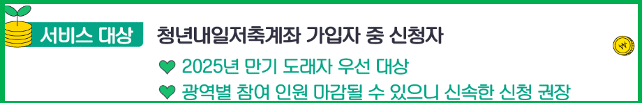 본 서비스는 청년내일저축계좌 가입자 중 신청자를 대상으로 제공됩니다. 특히 2025년 만기 도래자는 우선 선정되며, 조기 마감 가능성이 있어 빠른 신청이 권장됩니다.